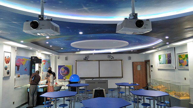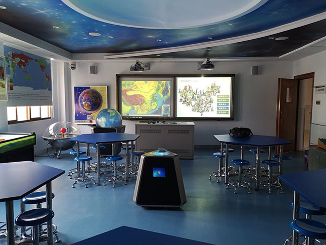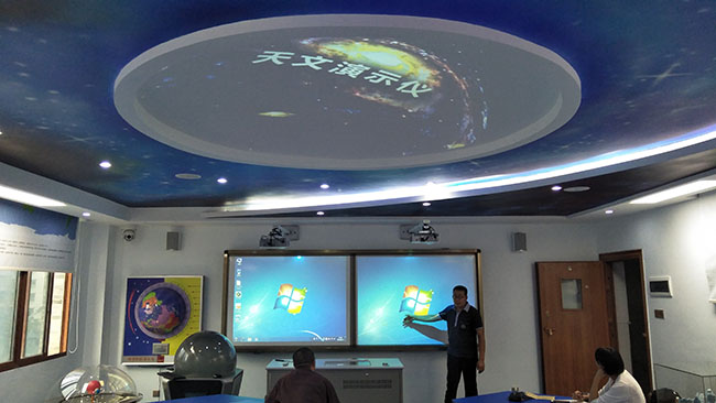 環(huán)幕示教系統(tǒng)位于教室后方,占據(jù)一整塊墻面,強大的視覺沖擊牢牢抓住學(xué)生的視線。以曲面投影顯示形式,播放宇宙與地球,地質(zhì)災(zāi)害等視頻資料,還可用于3S教學(xué)及課外科普影片的播放。用于教學(xué)的課程導(dǎo)入,每每都能起到事半功倍的效果,為整堂課的教學(xué)開個好頭。