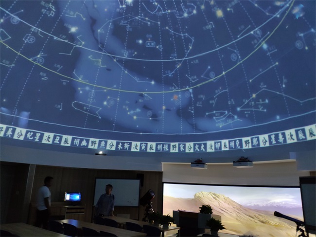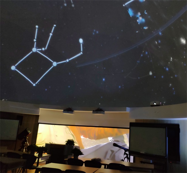 多通道融合拼接配合先進的圖形處理、畫面渲染技術,呈現(xiàn)出極具整體感的超大影像畫面,像縮小的蒼穹一樣把學生籠罩其中,舉頭天望外,手可摘星辰。