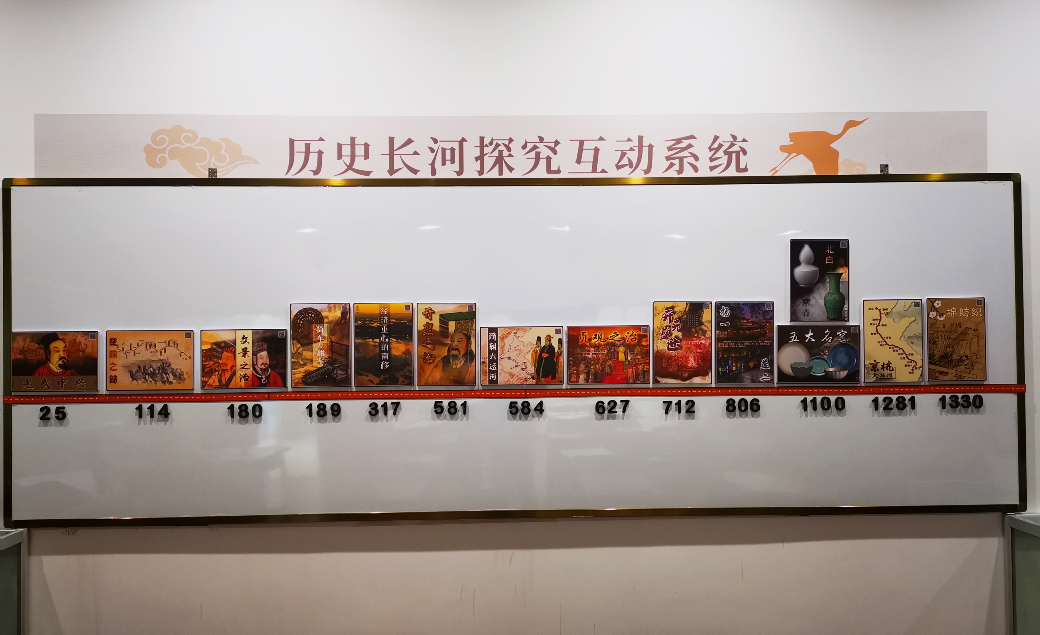 歷史長河探究互動系統(tǒng)系我司自主研發(fā)的歷史教學(xué)輔助系統(tǒng),其篩選出中國與世界萬年歷史長河中最重要的數(shù)百件歷史事件,并將相關(guān)圖片、文字、音頻、視頻等數(shù)字資源上傳至云端服務(wù)器,師生可通過對二維碼進(jìn)行掃描,從而提取其中所蘊含的可視化信息,進(jìn)而通過活動板墻的形式予以展示。探究系統(tǒng)能夠協(xié)助教師進(jìn)行歷史教學(xué),幫助學(xué)生梳理歷史脈絡(luò),從而達(dá)到并完成簡潔高效、活潑明晰的歷史教學(xué)任務(wù)。